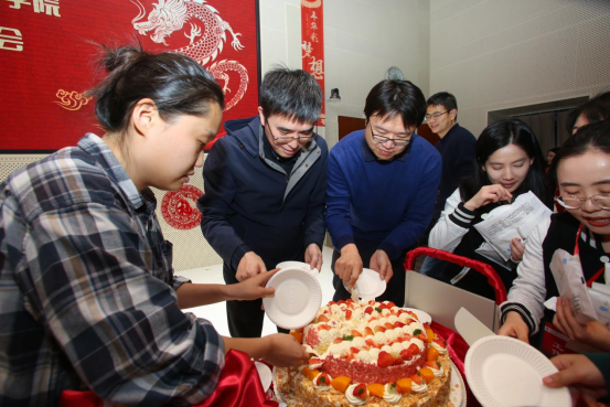 联欢活动的最后,即将迎来本命年的老师们被簇拥到台前,携手分切生日蛋糕,共同迎接新年的到来,将热烈的气氛推向高潮。