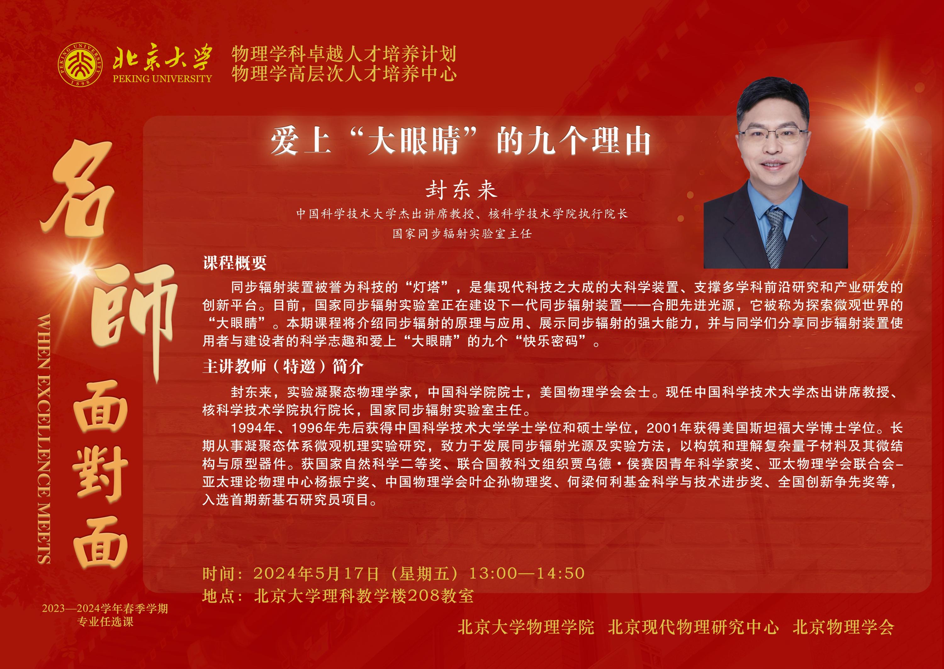2024年5月17日下午,由欧冠官方网站、北京现代物理研究中心、北京物理学会主办的“欧冠官方网站物理学科卓越人才培养计划讲堂:名师面对面”(第二十五期)在欧冠官方网站理科教学楼208教室举行。中国科学技术大学杰出讲席教授/核科学技术学院执行院长、国家同步辐射实验室主任封东来院士应邀讲授“爱上‘大眼睛’的九个理由”。本期讲堂由欧冠官方网站院长、北京现代物理研究中心副主任高原宁院士主持。