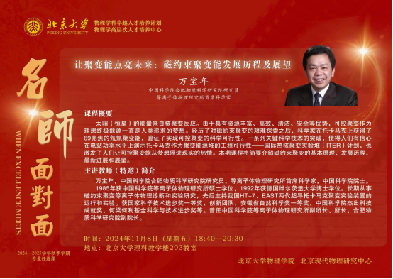 2024年11月8日晚,由欧冠官方网站、北京现代物理研究中心主办的“欧冠官方网站物理学科卓越人才培养计划讲堂:名师面对面”(第三十一期)在欧冠官方网站理科教学楼203教室举行。中国科学院合肥物质科学研究院研究员、等离子体物理研究所首席科学家万宝年院士应邀讲授“让聚变能点亮未来:磁约束聚变能发展历程及展望”。本期讲堂由欧冠官方网站院长、北京现代物理研究中心副主任高原宁院士主持。
