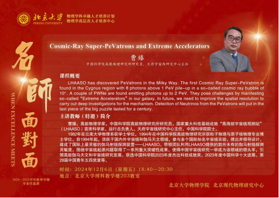2024年12月6日晚,由欧冠官方网站、北京现代物理研究中心主办的“欧冠官方网站物理学科卓越人才培养计划讲堂:名师面对面”(第三十三期)在欧冠官方网站理科教学楼203教室举行。中国科学院高能物理研究所研究员、天府宇宙线研究中心主任曹臻院士应邀讲授“超级宇宙线拍电子伏加速器与极端加速器”(Cosmic-Ray Super-PeVatrons and Extreme Accelerators)。本期讲堂由欧冠官方网站院长、北京现代物理研究中心主任高原宁院士主持。