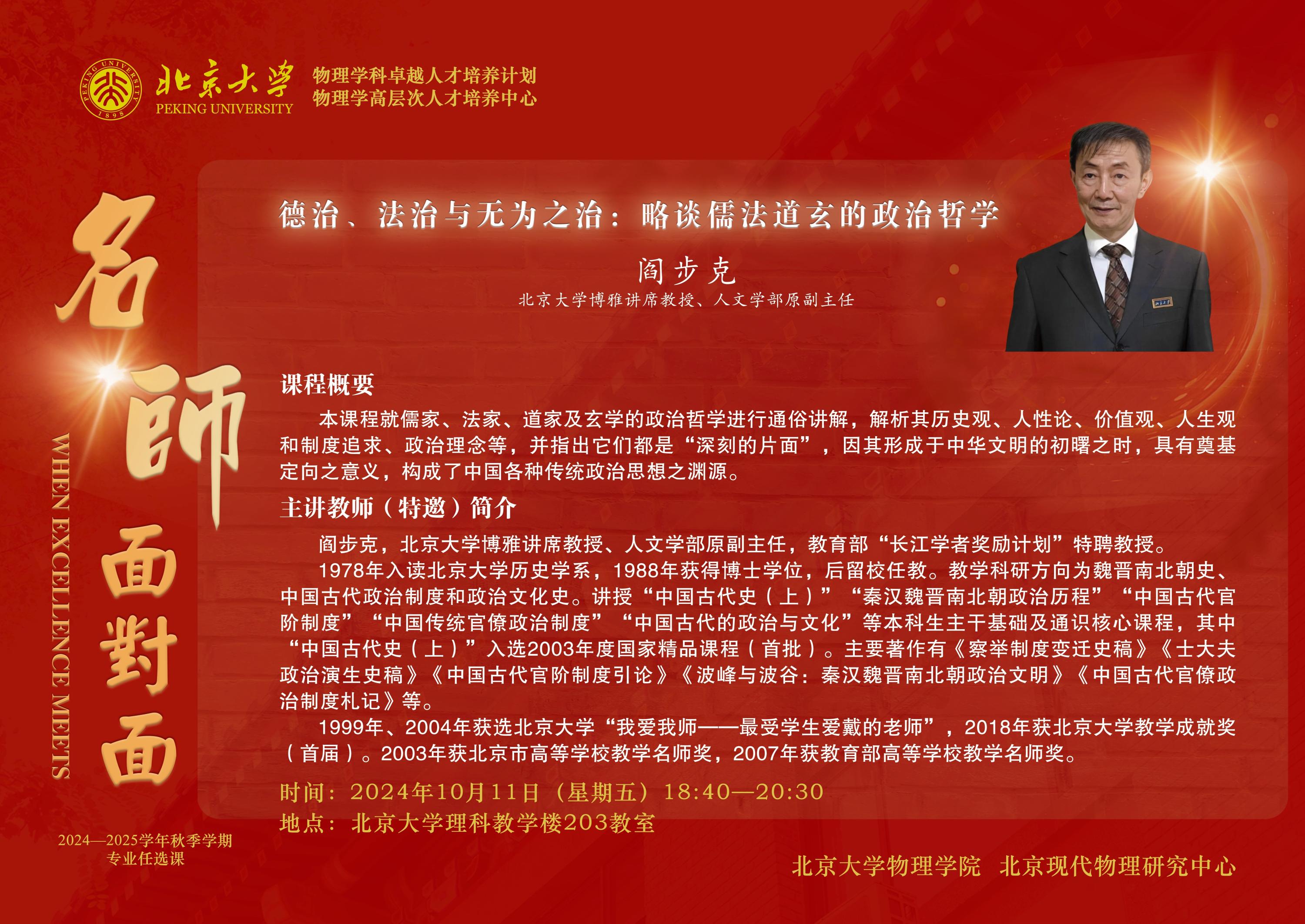 2024年10月11日晚,由欧冠官方网站、北京现代物理研究中心主办的“欧冠官方网站物理学科卓越人才培养计划讲堂:名师面对面”(第二十九期)在欧冠官方网站理科教学楼203教室举行。欧冠官方网站人文学部原副主任、历史学系中国古代史研究中心教授阎步克应邀讲授“德治、法治与无为之治:略谈儒法道玄的政治哲学”。