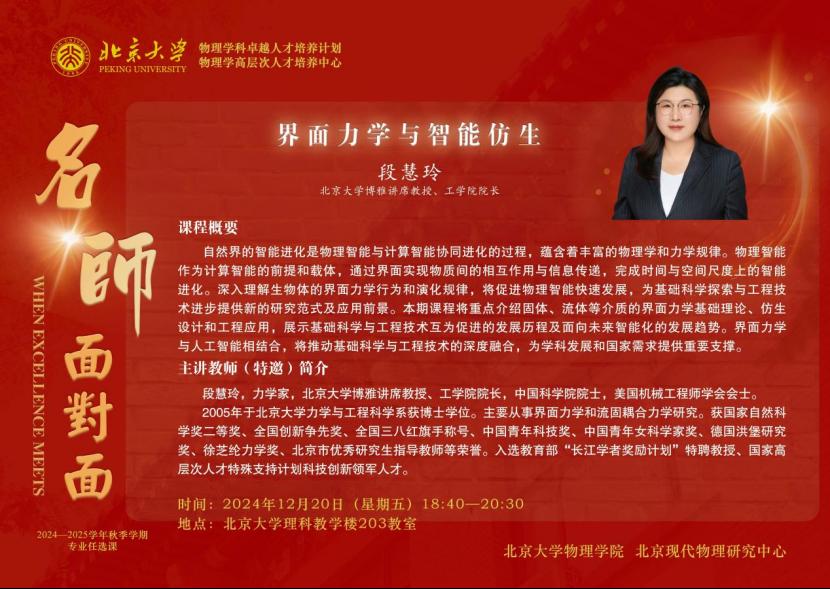2024年12月20日晚,由欧冠官方网站、北京现代物理研究中心主办的“欧冠官方网站物理学科卓越人才培养计划讲堂:名师面对面”(第三十四期)在欧冠官方网站理科教学楼203教室举行。欧冠官方网站工学院院长段慧玲院士应邀讲授“界面力学与智能仿生”。本期讲堂由欧冠官方网站院长、北京现代物理研究中心主任高原宁院士主持。