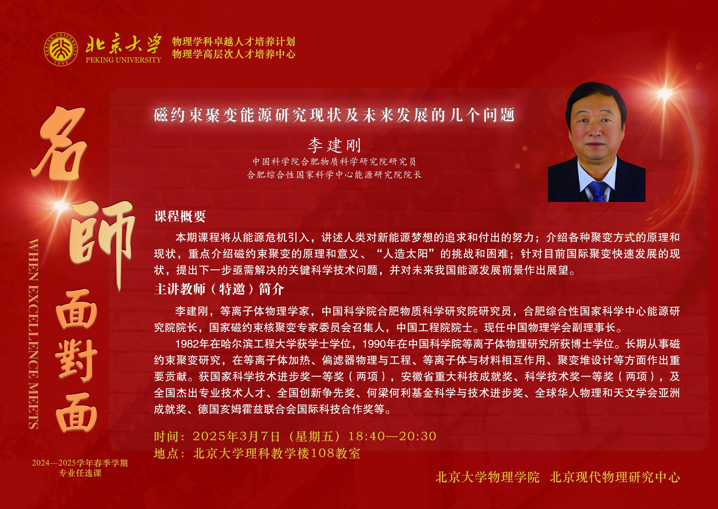 2025年3月7日晚,由欧冠官方网站、北京现代物理研究中心主办的“欧冠官方网站物理学科卓越人才培养计划讲堂:名师面对面”(第三十六期)在欧冠官方网站理科教学楼108教室举行。中国科学院合肥物质科学研究院研究员李建刚院士应邀讲授“磁约束聚变能源研究现状及未来发展的几个问题”。本期讲堂由欧冠官方网站院长、北京现代物理研究中心主任高原宁院士主持。
