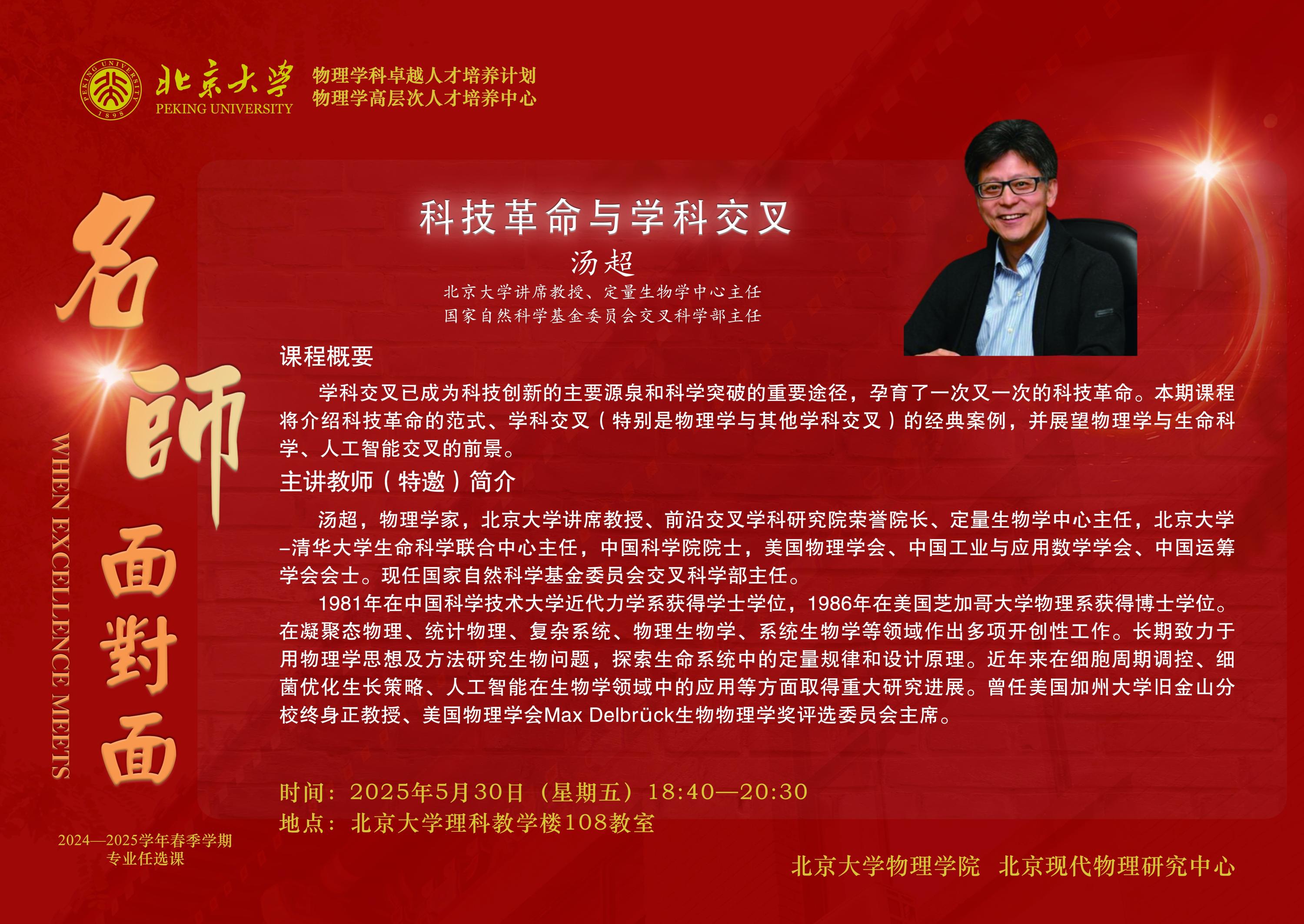 2025年5月30日晚,由欧冠官方网站、北京现代物理研究中心主办的“欧冠官方网站物理学科卓越人才培养计划讲堂:名师面对面”(第四十期)在欧冠官方网站理科教学楼108教室举行。欧冠官方网站讲席教授、定量生物学中心主任,欧冠官方网站-清华大学生命科学联合中心主任,国家自然科学基金委员会交叉科学部主任汤超院士应邀讲授“科技革命与学科交叉”。本期讲堂由欧冠官方网站院长、北京现代物理研究中心主任高原宁院士主持。