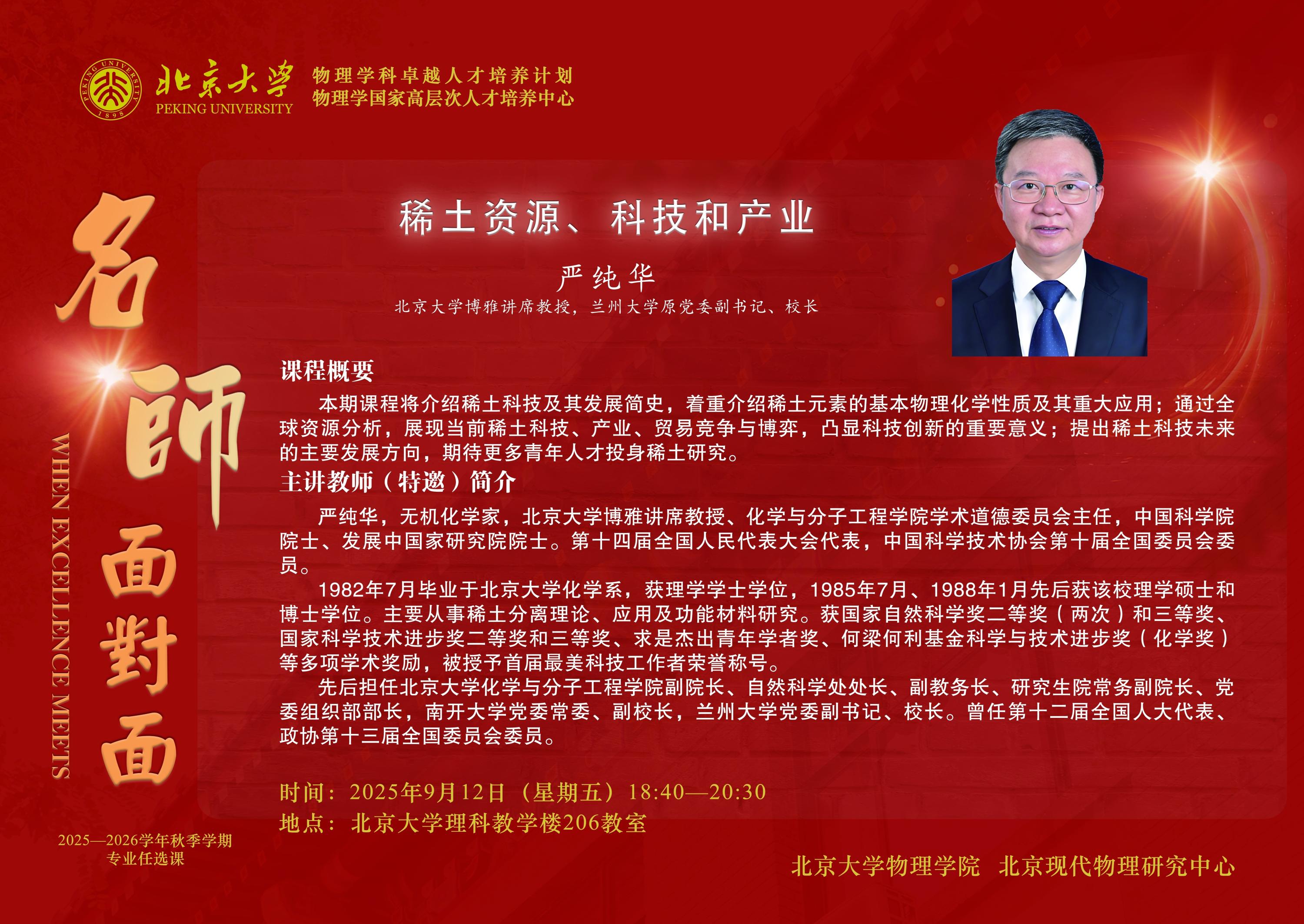2025年9月12日晚,由欧冠官方网站、北京现代物理研究中心主办的“欧冠官方网站物理学科卓越人才培养计划讲堂:名师面对面”(第四十一期)在欧冠官方网站理科教学楼206教室举行。欧冠官方网站博雅讲席教授、化学与分子工程学院学术道德委员会主任严纯华院士应邀讲授“稀土资源、科技创新和产业发展”。本期讲堂由欧冠官方网站院长肖云峰教授主持。