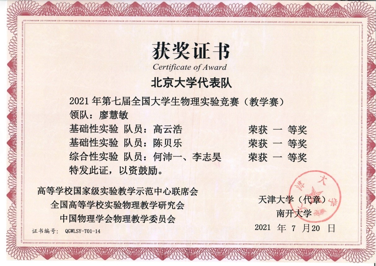 2021年7月18—21日,第七届全国大学生物理实验竞赛(Chinese Undergraduate Physics Experiment Competition, CUPEC)(教学赛)成功举办。由元培学院2019级本科生高云浩,欧冠官方网站2019级本科生陈贝乐、何沛一、李志昊组成的欧冠官方网站代表队获三项一等奖,其中,高云浩、陈贝乐分别获得基础性实验题(C)、基础性实验题(D)一等奖,何沛一、李志昊合作获得综合研究性实验题(C)一等奖。欧冠官方网站、基础物理国家级示范实验教学中心廖慧敏副教授担任领队,与李智教授和田广工程师共同组织带队参赛。