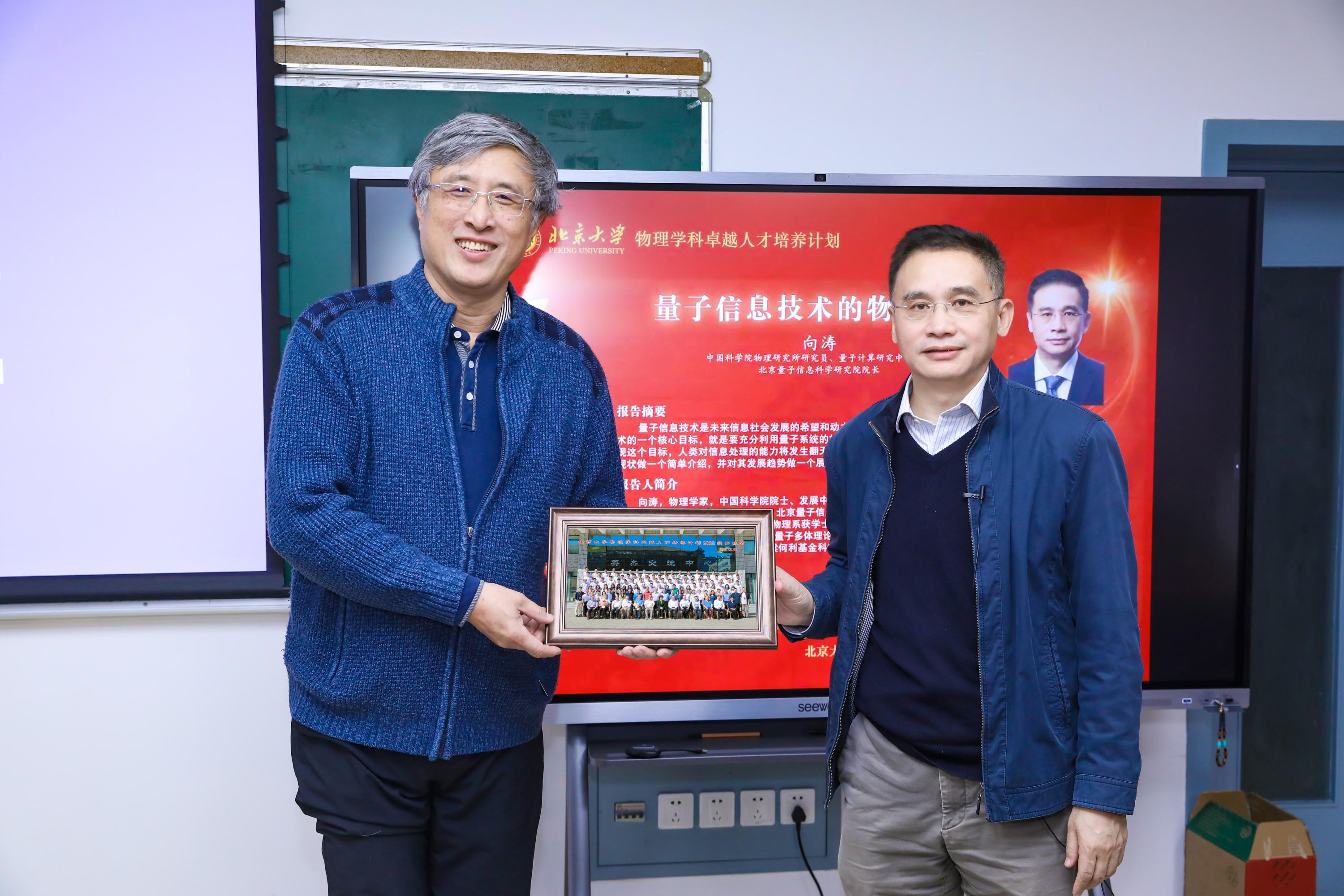 2022年10月21日晚,由北京现代物理研究中心、欧冠官方网站、北京物理学会主办的欧冠官方网站物理学科卓越人才培养计划“名师面对面”第三场活动在欧冠官方网站老化学楼东配楼101教室举行。中国科学院物理研究所研究员、北京量子信息科学研究院院长、“物理卓越计划”科学指导委员会副主任向涛院士应邀作了题为“量子信息技术的物理基础”的报告。本场活动由欧冠官方网站院长、北京现代物理研究中心副主任高原宁院士主持。