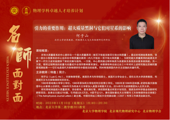 2023年11月10日晚,由欧冠官方网站、北京现代物理研究中心、北京物理学会主办的“欧冠官方网站物理学科卓越人才培养计划讲堂:名师面对面”(第十六期)在欧冠官方网站第二教学楼301教室举行。欧冠官方网站讲席教授、科维理天文与天体物理研究所所长,美国艺术与科学院院士何子山应邀讲授“引力的重要作用:超大质量黑洞与它们对星系的影响”(Gravity’s Fatal Attraction: Supermassive Black Holes and their Impact on Galaxies)。本期讲堂由欧冠官方网站院长、北京现代物理研究中心副主任高原宁院士主持。