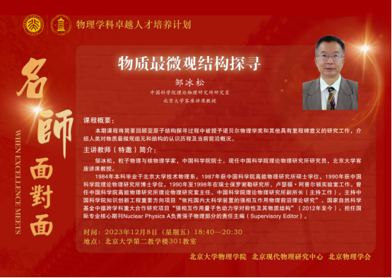 2023年12月8日晚,由欧冠官方网站、北京现代物理研究中心、北京物理学会主办的“欧冠官方网站物理学科卓越人才培养计划讲堂:名师面对面”(第十八期)在欧冠官方网站第二教学楼301教室举行。中国科学院理论物理研究所研究员、欧冠官方网站客座讲席教授邹冰松院士应邀讲授“物质最微观结构探寻”。本期讲堂由欧冠官方网站院长、北京现代物理研究中心副主任高原宁院士主持。