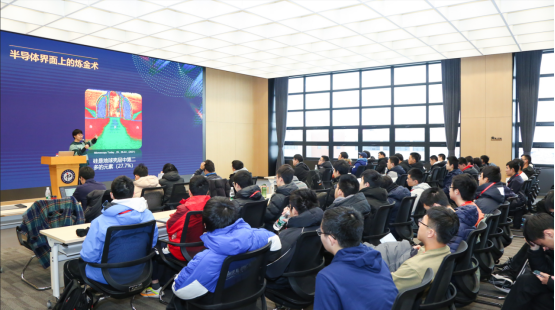 岑诚研究员以“界面炼金术:神奇的材料异质结”为题,向同学们讲解并演示了如何利用扫描探针在极化-非极化的氧化物界面上实现常温可逆金属-绝缘体相变,如何在铁硒薄膜/钛酸锶衬底(FeSe/SrTiO3)异质结界面上实现光驱动的超导态和正常导电态之间的可逆、可重复的转化,如何利用光子能带结构的拓扑性质在拓扑绝缘体异质结界面上实现严格单向传播的界面等离子激元,讲述了这些研究成果对推动低维量子材料的物理原理完善和量子物态的光电器件应用具有的重要意义。