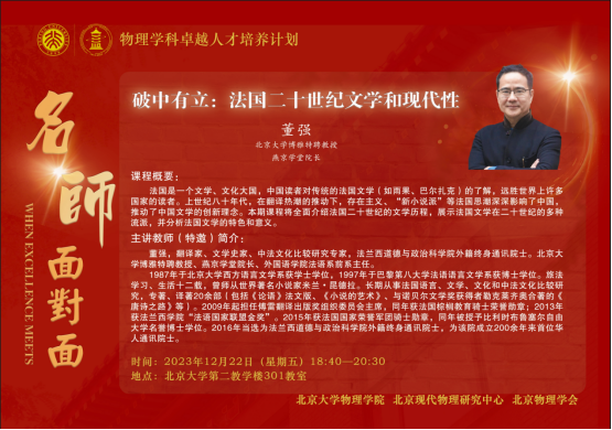2023年12月22日晚,由欧冠官方网站、北京现代物理研究中心、北京物理学会主办的“欧冠官方网站物理学科卓越人才培养计划讲堂:名师面对面”(第十九期)在欧冠官方网站第二教学楼301教室举行。欧冠官方网站博雅特聘教授、燕京学堂院长董强教授应邀讲授“破中有立:法国二十世纪文学和现代性”。本期讲堂由欧冠官方网站院长、北京现代物理研究中心副主任高原宁院士主持。