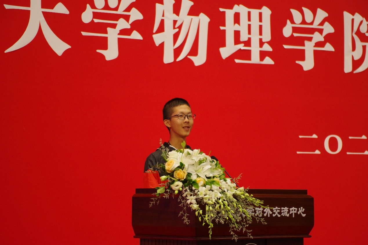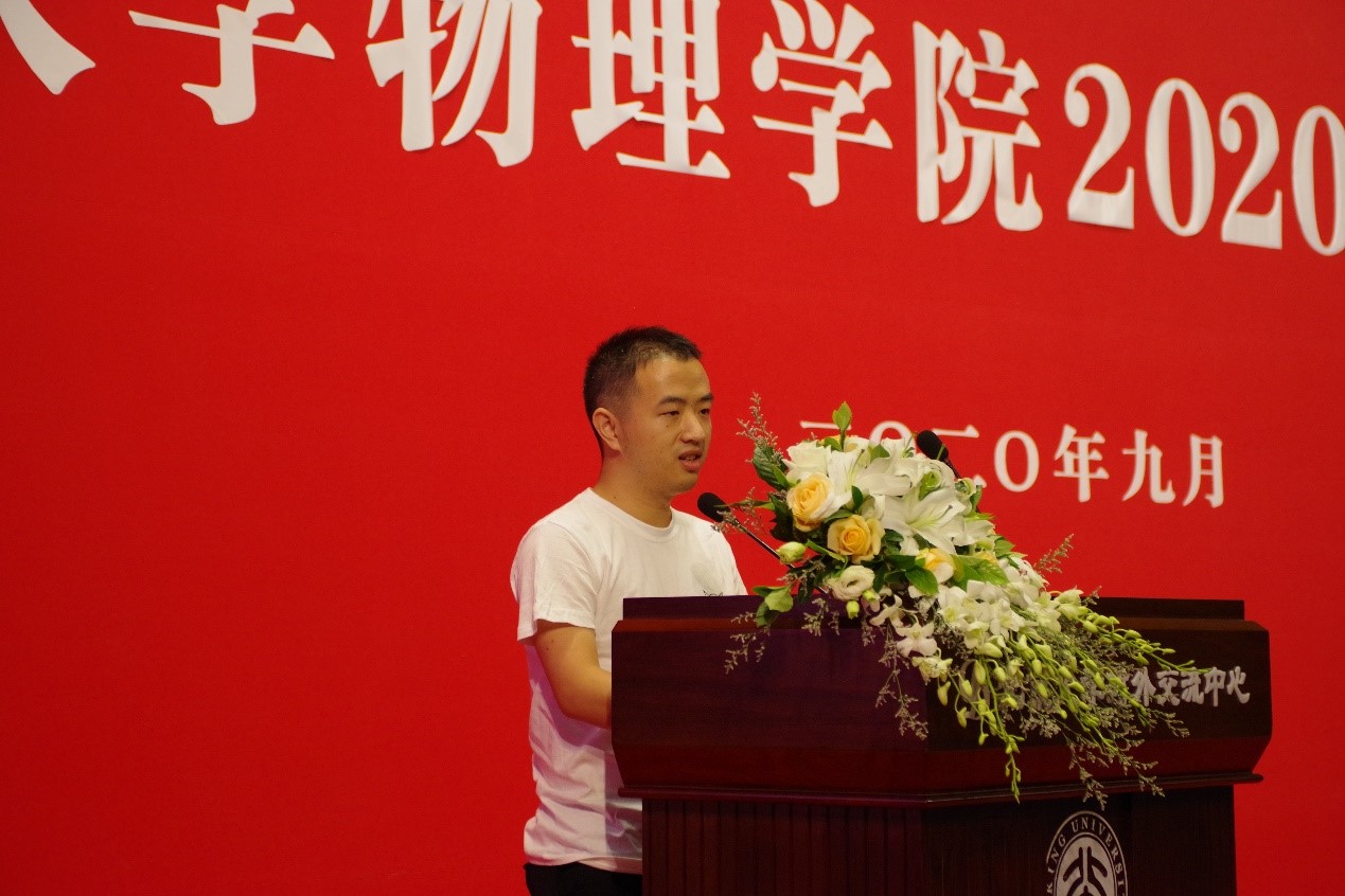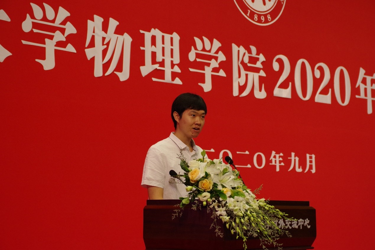 首先,研究生新生代表、20级博士生金少亮发言。他分享了本科生涯中逐渐确立追寻物理学研究的目标的心路历程,也在实际的科研工作中逐渐明白“不再是物理学的欣赏者而是构建者”。金少亮希望与同学们一起,在不断拓展人类认识的边界、用双手构建新的未知上,能够肩负起时代使命,在北大物院书写新的青春篇章。