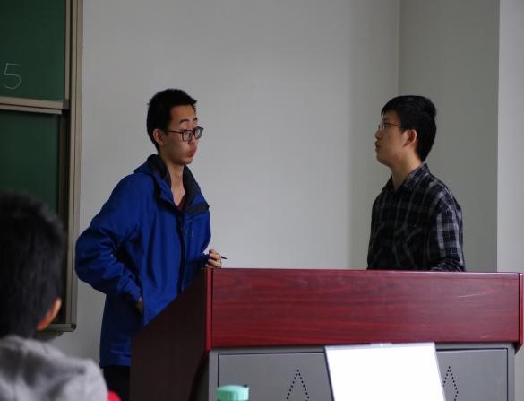 在接到比赛通知后,三支队伍迅速集合,共同来到了理科教学楼的109室参加决赛。首先陈曦组的梅文聪作为正方向大家展示了同步蜡烛。在展示中正方通过丰富的引用和理论推导,向大家证明了两组蜡烛耦合的原理。反方代表邹子航对正方展示中热辐射和热对流的实验方法和理论提出了质疑。评论方代表穆济生随后对两方的优点缺点进行了点评,对热对流与热辐射探究的方法提出了质疑。几位评委老师也针对正方的时间把控问题进行了点评。在第2阶段中,正方代表易琴砚向大家展示了韦氏摆。在实验中正方严谨的用实验印证了韦氏摆的理论,得出了较好的结果。反方代表穆济生对正方的实验测量的严谨性提出了质疑。随后评论方代表陈曦进行发言,指出了正方一些实验规范上的问题。评委老师也提出了不少后续研究的可行方案。在决赛第3阶段,正方代表石霆章向大家展示了吸水海绵。正方通过新颖的模型与严格的计算,给出了较为完善的实验结果。反方代表陈蔓佳对实验中的一些实验模型和细节提出了质疑。随后评论方代表喻翼航进行发言,对一些模型近似的具体细节进行了评价。老师表扬了这组展示中各方都做的比较完善,也提出了些许改进意见,比如对仪器的使用等方面。