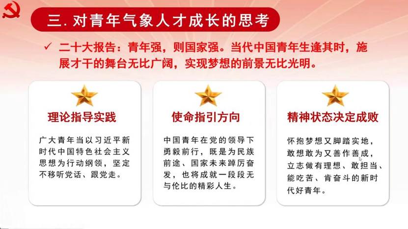 11月19日下午,欧冠官方网站在线上举行了“坚定不移听党话跟党走,为建设气象强国贡献青春力量”二十大精神主题讲座。本次活动邀请二十大代表、中央气象台首席预报员、中国气象局首席气象专家张芳华与欧冠官方网站的青年学子进行交流,结合气象科技的发展历程,讲解党的二十大的精神。欧冠官方网站党委书记刘雨龙、党委副书记穆良柱出席了本次会议。