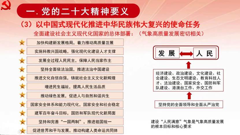张芳华首先通过习近平总书记在参加广西代表团讨论时所提出的“五个牢牢把握”,具体阐述党的二十大的精神要义。张芳华指出,党的二十大报告中对全面建设社会主义现代化国家所作出的总体部署,每一条都直接或间接地与气象工作的高质量发展相关,气象工作更是对其中民生保障、绿色发展、国家安全等方面起到了重要的支撑作用。她着重讲解了报告中的“实施科教兴国战略,强化现代化建设人才支撑”,分析总结了这一战略对于大学和科技工作者所提出的要求。