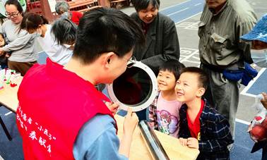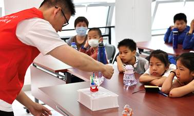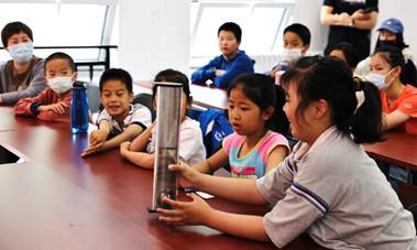 “小朋友们,你们觉得这个球能穿过这个小挡板吗?”只见,志愿者拿起一个装有圆球的圆筒演示起了“穿墙而过”实验,参与者们惊奇地看到圆球穿过挡板。在大家疑惑和吃惊中,志愿者向大家解释这与光的偏振密切相关,并列举了光的偏振在汽车行驶、3D电影观看中的应用。