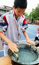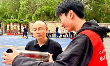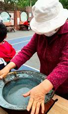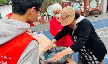 最吸引人的莫过于鱼洗共振实验,志愿者通过双手来回摩擦鱼洗盆铜耳从而产生两个振动源,振动波在水中传播,相互干扰,使能量叠加,就使得盆内的水花跳跃。在志愿者的帮助下,大家跃跃欲试,场面热烈活跃。通过讲解共振现象在生活中的应用,大家感觉到物理奥秘无处不在。