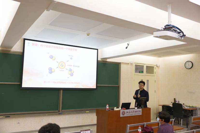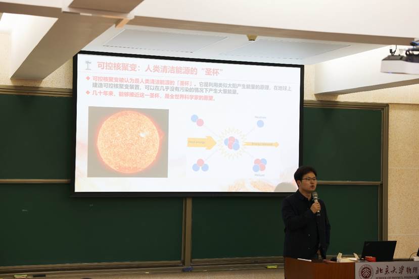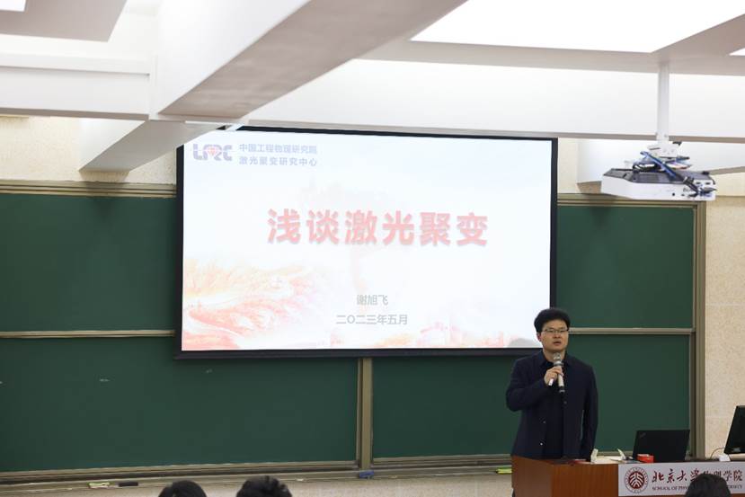 在讲座的开场,谢旭飞老师首先带领同学们探讨了激光聚变的基本原理。他通过精心设计的讲座内容和生动形象的讲解,使这一极其复杂的理论变得清晰易懂。他结合美国的NIF项目,详细介绍了激光聚变技术的发展历程。这个发展过程中虽然遭遇了不少挫折,但在谢老师的讲述下,同学们感受到了科研中所需要的不屈不挠、勇往直前的精神。