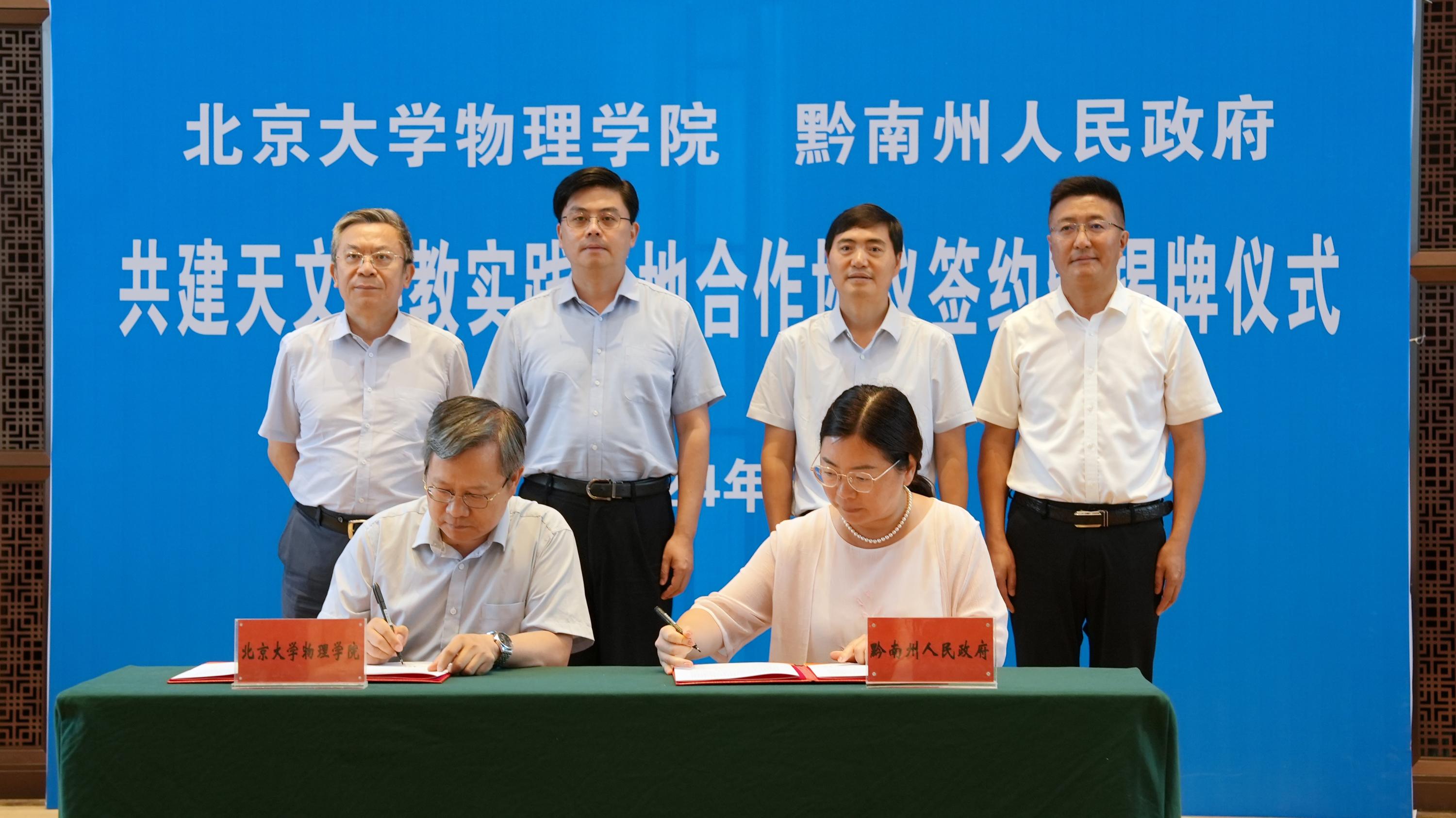 8月22日,欧冠官方网站、贵州省黔南州人民政府共建天文科教实践基地合作协议签约暨揭牌仪式在黔南州平塘县举行。欧冠官方网站党委常委、副校长方方,黔南州委副书记、州长向承强共同为欧冠官方网站“中国天眼”天文科教实践基地揭牌。欧冠官方网站天文学系主任吴学兵和黔南州委常委、副州长吴学俊分别代表双方签署合作协议。在贵州参加欧冠官方网站高层次人才国情研修班的欧冠官方网站人民医院血液病研究所所长、中国工程院院士黄晓军及部分院系和职能部门十余名负责人,黔南州有关部门及平塘县主要负责人,以及中国科学院国家天文台相关人员参加了签约和揭牌仪式。仪式由黔南州副州长杨再军主持。