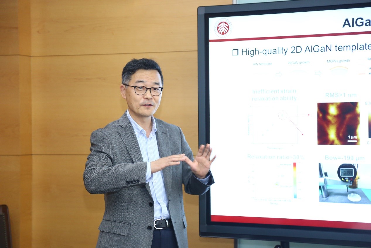 王新强、边珂等欧冠官方网站教师代表与来访人员开展了深入座谈交流。王新强首先介绍了欧冠官方网站宽禁带半导体研究中心的基本概况,并就三族氮化物量子结构的外延和器件应用方面作了报告,介绍了团队在氮化镓(GaN)基深紫外光源、红光微型发光二极管、高迁移率薄膜、准范德华外延、原子级表征及铁电材料等领域取得的重要进展,及部分成果的产业转化情况。