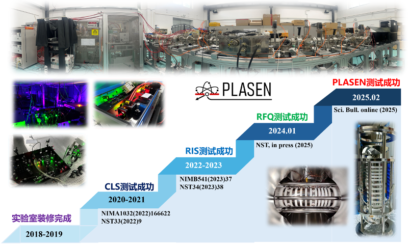 本课题组从2018年开始,在国内从无到有牵头发展用于不稳定核研究的精密激光核谱技术,分阶段取得系列进展,如图1所示。2021年首先研制成功基于激光诱导荧光探测的共线激光谱(CLS: Collinear Laser Spectroscopy)技术并完成离线测试 (NST33(2022)9,本课题组2022届博士研究生白世伟的博士论文工作),实现了高分辨的超精细结构谱测量,同时在我国的BRIF放射性核束装置上实现在线不稳定核测量(NIMA1032(2022)166622, 本课题组2023届博士研究生王姝婧的博士论文工作)。与此同时,完整发展了用于激光核谱仪的控制、数据采集和获取系统,在离线和在线实验中应用(NST34(2023)38, 本课题组2024届博士研究生刘永超的博士论文工作)。2023年,为了解决荧光探测的高本底问题,在共线激光谱的基础上,本课题组进一步发展了共振电离激光谱技术(RIS: Resonance Ionization Spectroscopy,NIMB541(2023)37, 本课题组2024届博士研究生张鹏的博士论文工作),采用多步激光共振电离与离子探测的方式实现了超精细结构谱测量。为了解决放射性核束装置上在线实验束流能量离散大和连续束流模式带来的低灵敏度问题,课题组与欧洲核子研究中心合作,成功研发了射频四极冷却聚束器(RFQ: RadioFrequency Quadrupole cooler-buncher),成功实现了束流的脉冲化(NST, Accepted(2025),2025届博士研究生刘寅绅的博士论文工作)。