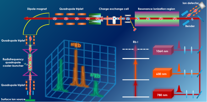 图1:本课题组在高分辨高灵敏度共线共振电离激光谱仪研发中的分阶段系列进展示意图。