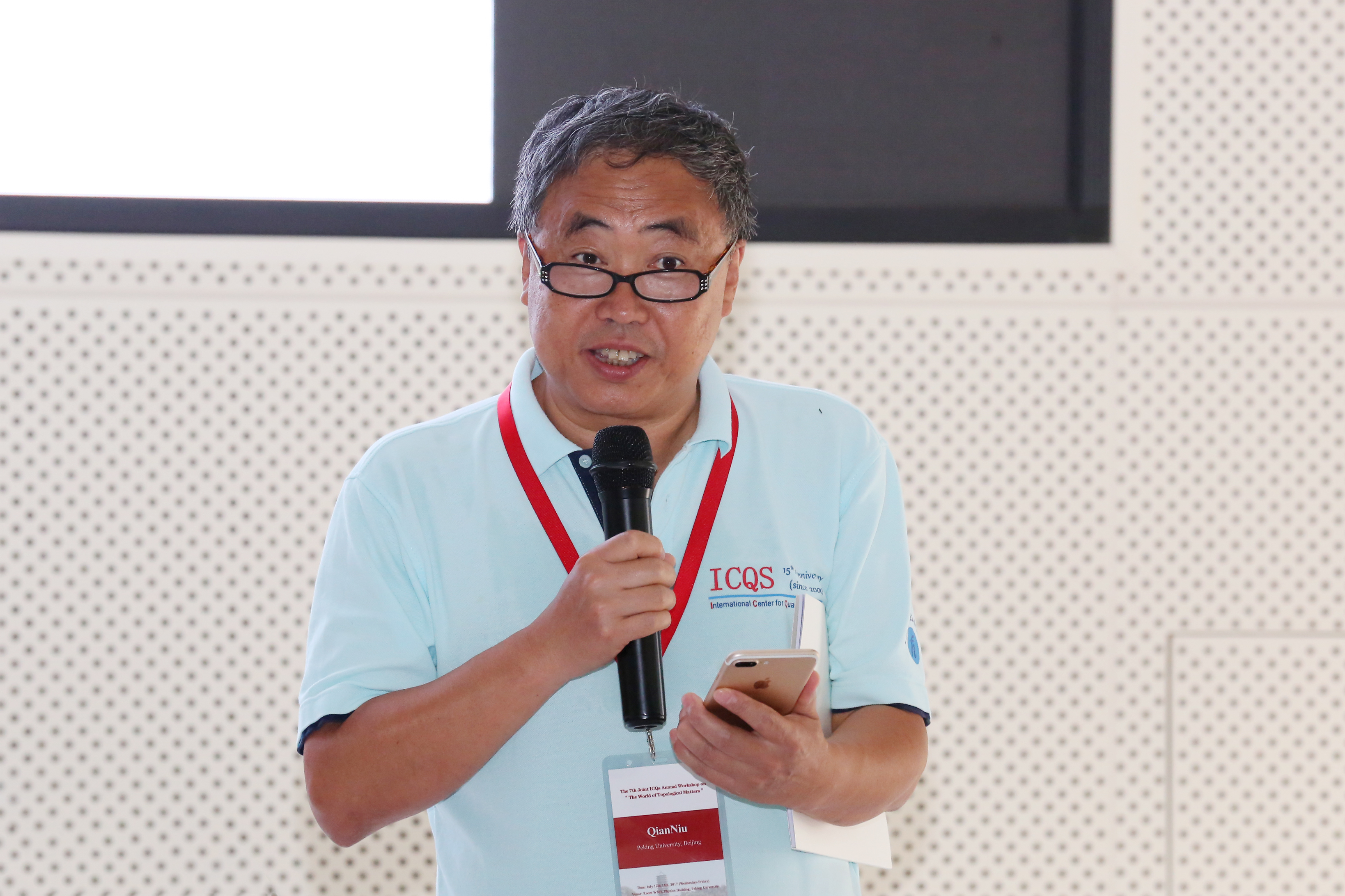 牛谦教授首先介绍了Duncan Haldane教授的研究经历以及学术成就并对各位参会师生表示欢迎。随后,Haldane教授深入浅出地介绍了量子物质的拓扑相及纠缠。Haldane教授首先介绍了纠缠(Entanglement)这一概念。他讲道,纠缠这一概念源于爱因斯坦“第二大错误”的EPR佯谬,所谓的“鬼魅的超距作用”。在拓扑态中,纠缠占据着中心地位。拓扑态具有诸多奇异的性质,例如准粒子电荷、自旋的分数化,稳定的边界态,以及非标准交换统计。