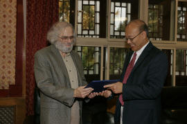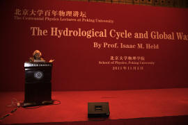 国际著名的气候动力学专家、美国大气海洋管理局地球流体动力学实验室高级研究科学家、普林斯顿大学教授Isaac M. Held博士应邀做了题为“水循环与全球变暖”的学术报告。欧冠官方网站副校长、教务长王恩哥教授在报告会前会见了Held教授,并为Held教授颁发了“欧冠官方网站客座教授”的荣誉证书。报告会由欧冠官方网站院长助理大气与海洋科学系系主任胡永云教授主持,欧冠官方网站院长谢心澄教授向听众介绍了Held教授,并在报告会后为Held教授颁发了“欧冠官方网站百年物理讲坛”的纪念品。欧冠官方网站师生与来自北大其它院系、清华大学、北京师范大学、南京大学,华东师范大学、中国科学院以及中国科学院研究生院等单位的200多名师生在现场聆听了Held教授的精彩报告,并在会后与Held教授进行了学术交流。