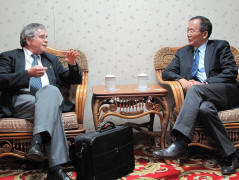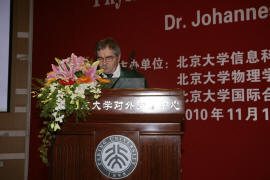 诺贝尔物理学奖获得者Johannes Georg Bednorz博士应邀做了题目为“纳米尺度物理——通向新技术之路”的学术报告。欧冠官方网站常务副校长林建华在报告会前会见了Bednorz博士,并在报告会上致欢迎辞。欧冠官方网站师生与来自北大、中科院、国家纳米科学中心等单位的近300多名听众在现场聆听了Bednorz博士的精彩报告,并在会后与Bednorz博士热烈交流。