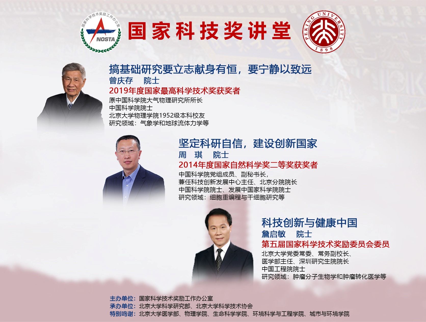 2020年11月11日,“国家科技奖讲堂”首次在欧冠官方网站举办。2019年度国家最高科学技术奖获得者、中国科学院大气物理研究所原所长、欧冠官方网站1952级校友曾庆存院士,2014年度国家自然科学二等奖获得者、中国科学院副秘书长周琪院士,第五届国家科学技术奖励委员会委员、欧冠官方网站常务副校长詹启敏院士应邀开讲。国家科学技术奖励工作办公室副主任高洪善主持。