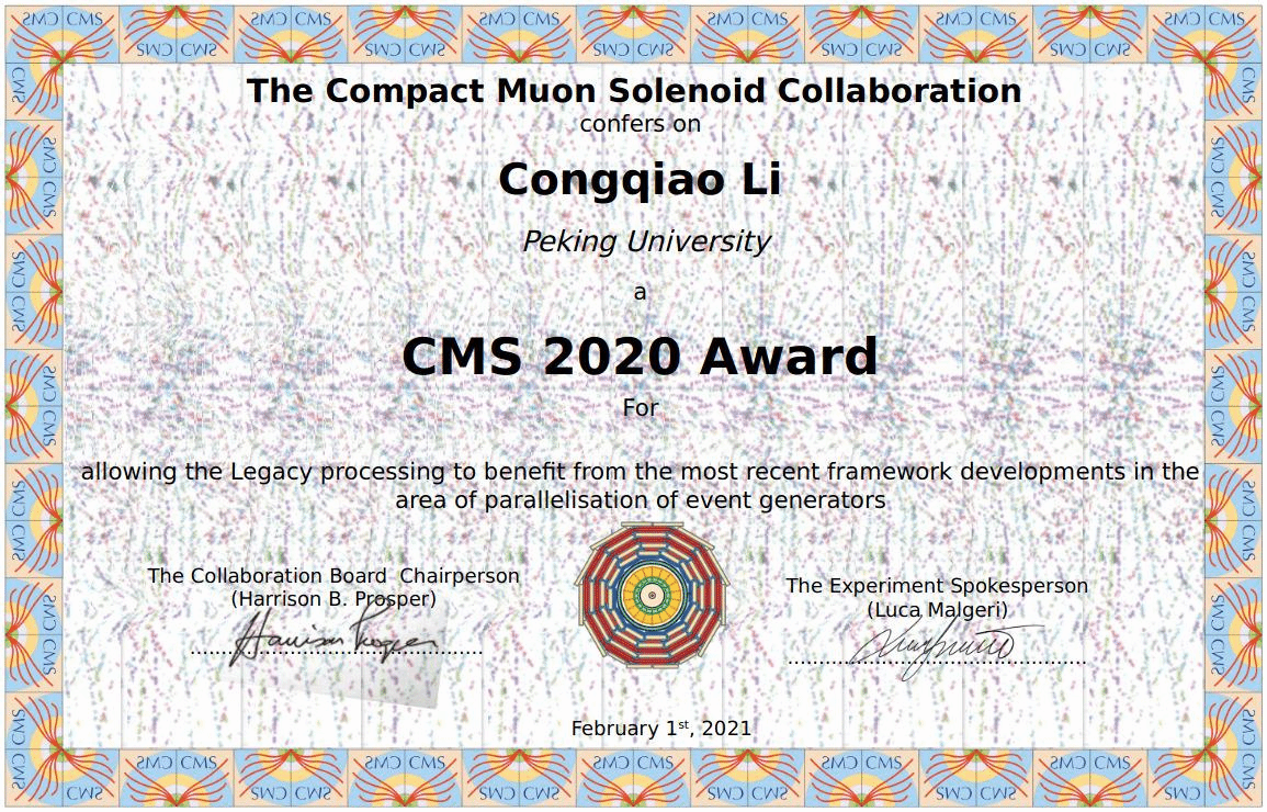 2021年2月2日CMS-Week会议顺利举行。欧冠官方网站技术物理系高能物理实验组2019级博士研究生李聪乔以“在事例产生子并行计算的开发和应用方面的贡献”(for allowing the Legacy processing to benefit from the most recent framework developments in the area of parallelisation of event generators)获得CMS实验组2020年度奖。