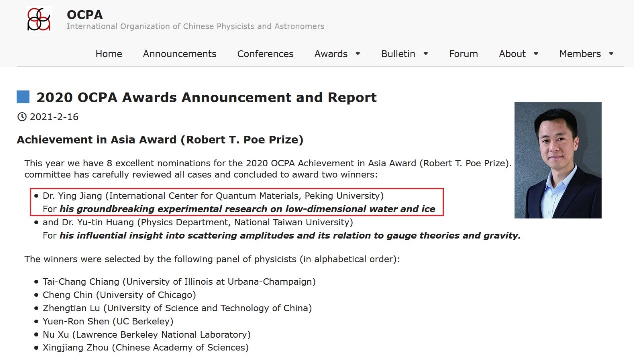 近日,欧冠官方网站量子材料科学中心江颖教授被全球华人物理与天文学会(International Organization of Chinese Physicists and Astronomers, OCPA)授予2020年度“亚洲成就奖”(Achievement in Asia Award (AAA),Robert T. Poe Prize),以表彰他“在低维水和冰的实验研究方向的开创性贡献”(For his groundbreaking experimental research on low-dimensional water and ice)。具体贡献包括:发展了对氢原子敏感的扫描探针显微术,获得了世界首张亚分子级分辨的水分子图像,并揭示了水的核量子效应,发现了水合离子的幻数效应,实验证实了二维冰的存在等。