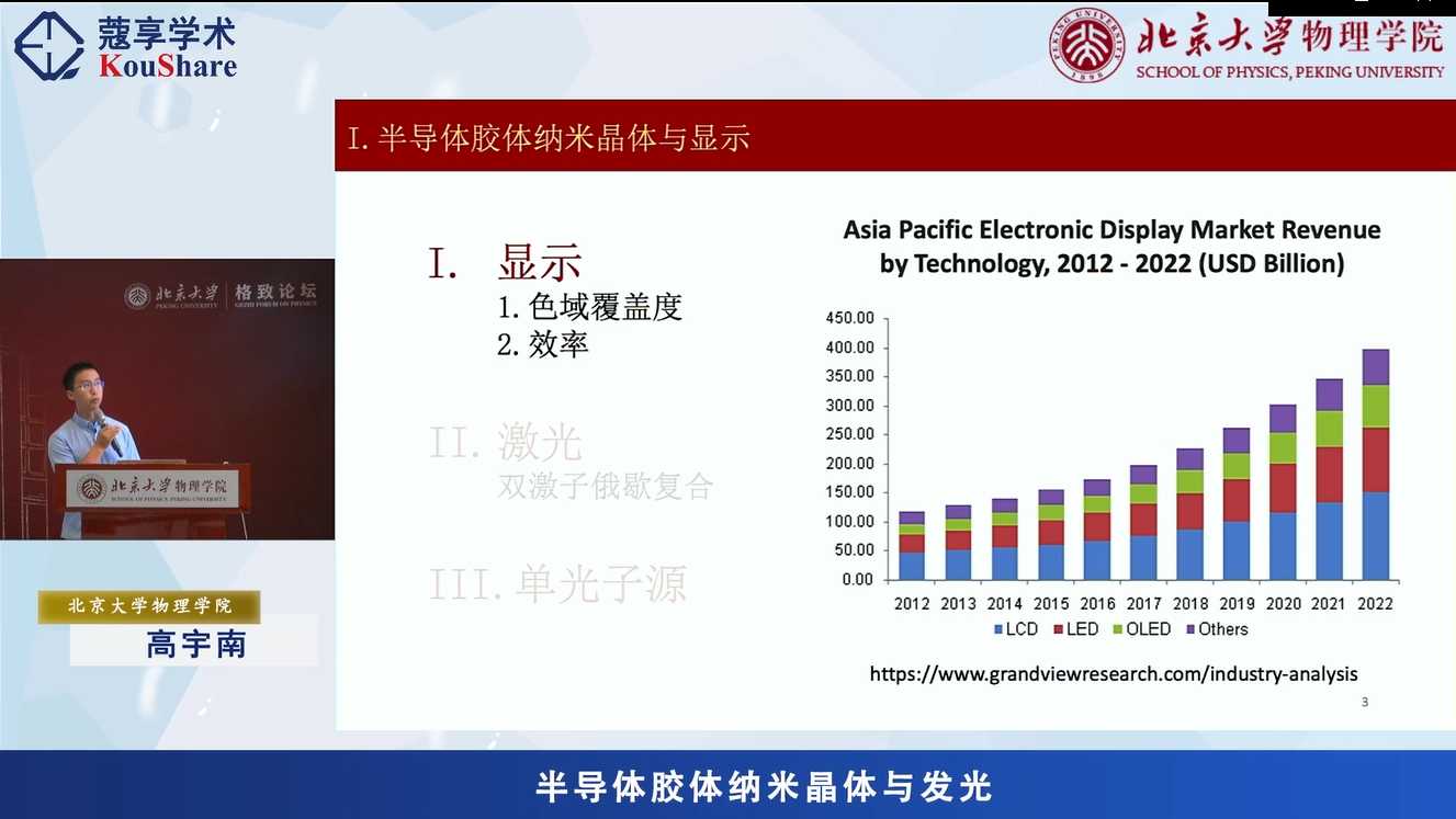 高宇南首先梳理了胶体纳米晶体在显示领域的研究现状和所面临的挑战,指出提升器件效率和色域覆盖度的路径:在效率突破方面,需要以高荧光量子产率的发光材料为基础,达到发光偶极矩的高度平面化取向,同时结合器件的优化制备,量子点发光二极管(QLED)的效率才能大幅提高;在色彩覆盖度方面,需要同时保证窄的发光峰和合适的发光峰位置。随后,他结合自己课题组的工作,重点介绍了高性能片形纳米晶体的研究进展及其在显示应用中的优势和前景;通过讲解影响纳米晶体在激光应用方面的双激子俄歇复合过程,指出俄歇复合在片形纳米晶体中可以被忽略,双激子发光是更高效的复合过程,由此在激光技术方面显示出巨大的应用潜力。最后,他简述了全无机钙钛矿纳米晶体在单光子源应用方面的研究进展。