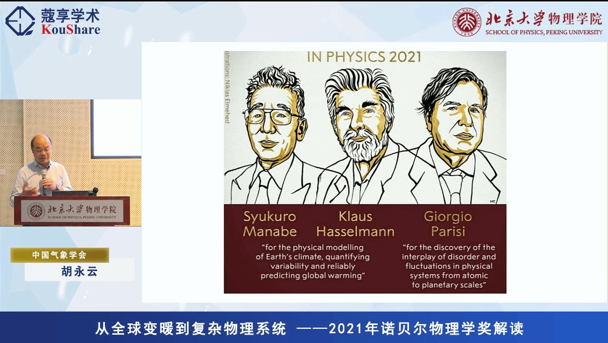 胡永云首先指出,两位气候学家获奖凸显了物理学奖委员会(Nobel Committee for Physics)对运用物理理论解决复杂现实问题,尤其是气候环境问题的高度重视。全球变暖问题之所以日益引发关注,不仅在于气候变暖这一观测事实,更深层的含义在于:人类活动是导致全球变暖的主要原因,而全球变暖将危害人类的生存环境。随后,他梳理了全球变暖问题近二百年的科学简史,以及傅里叶(Baron Jean Baptiste Joseph Fourier)、丁铎尔(John Tyndall)、阿伦尼乌斯(Svante August Arrhenius)、施瓦茨(Melvin Schwartz)、钱德拉塞卡(Subrahmanyan Chandrasekhar)等科学家为人类对于全球变暖建立科学认知所做的一系列重要贡献;阐述了人为原因导致地球增温这一定论有着坚实的科学基础;重点介绍了真锅淑郎(Syukuro Manabe)教授和克劳斯·哈塞尔曼(Klaus Hasselmann)教授在量化气候变率、建立可靠的预测全球变暖气候模型、检测和归因人类活动造成全球变暖的“指纹印记”方面所做出的开创性贡献,以及他们的学术生涯。最后,结合我国“碳达峰、碳中和”发展战略,讲解了全球变暖对世界、我国气候环境所产生的显著影响和极端灾害性天气气候事件等可能的危害。