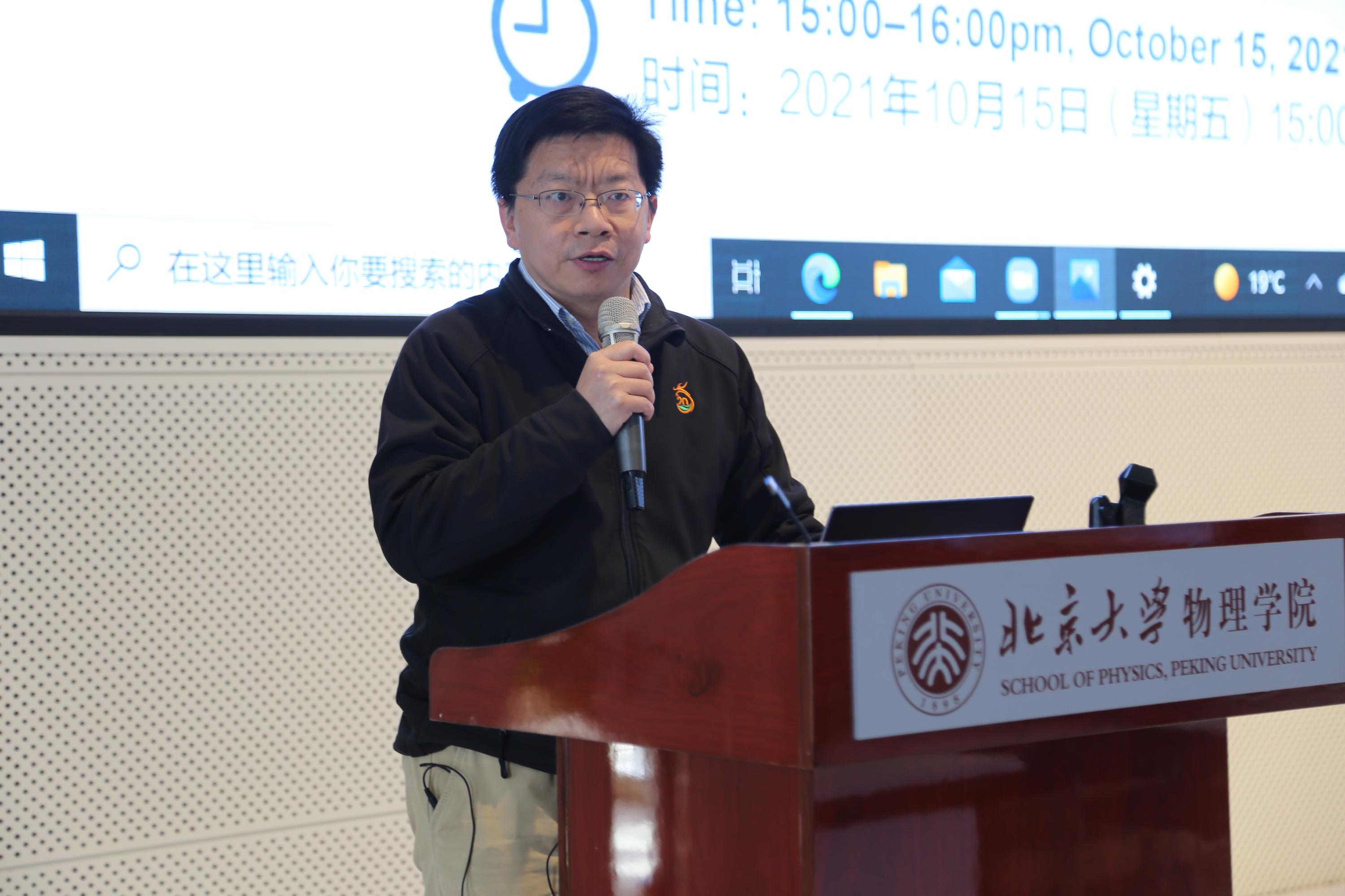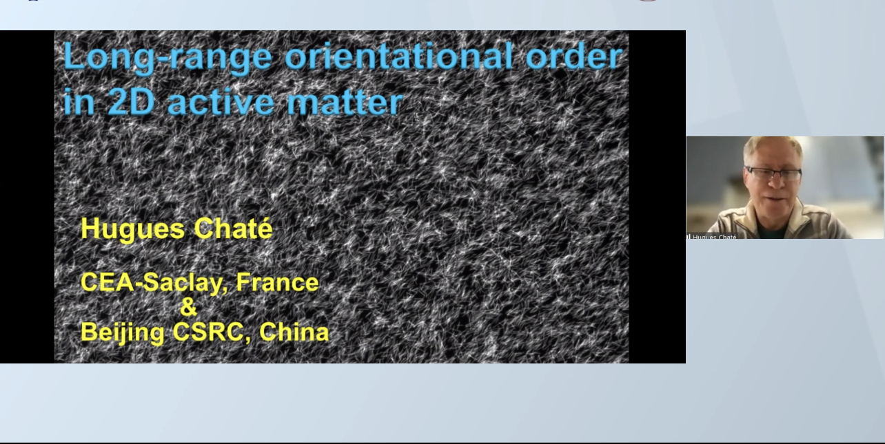 2021年10月15日,欧冠官方网站学术论坛2021年秋季学期第二讲(总第十讲)在物理西楼思源多功能厅成功举行。萨克雷大学教授、北京计算科学研究中心讲座教授、《物理评论快报》(Physical Review Letters)首席编辑(lead editor)Hugues Chaté应邀远程做了题为“二维活性物质的长程序”(Long-range orientational order in 2D active matter)的学术报告。本次论坛由欧冠官方网站凝聚态物理与材料物理研究所副所长全海涛教授主持。