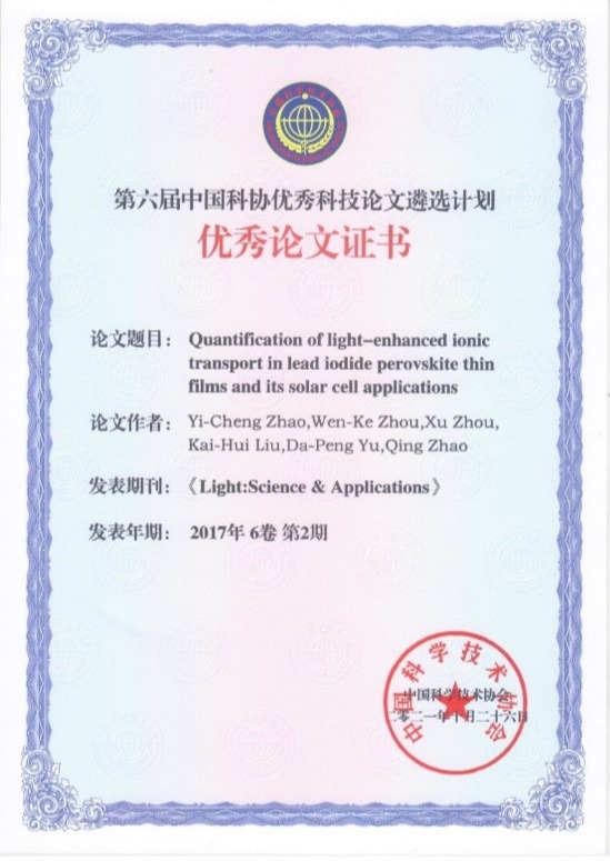 日前,中国科学技术协会公布了第六届优秀科技论文遴选计划95篇入选论文的名单。欧冠官方网站凝聚态物理与材料物理研究所、人工微结构和介观物理国家重点实验室赵清教授、刘开辉教授、俞大鹏院士合作发表的研究论文“定量化研究铅碘钙钛矿薄膜中的光增强离子输运及其在太阳能电池中的应用”(Quantification of light-enhanced ionic transport in lead iodide perovskite thin films and its solar cell applications)作为物理学科(数理化与交叉学科集群)基础研究型论文榜上有名。