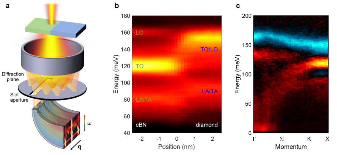 四维电子能量损失谱学实验原理示意图与金刚石-氮化硼界面声子的典型数据