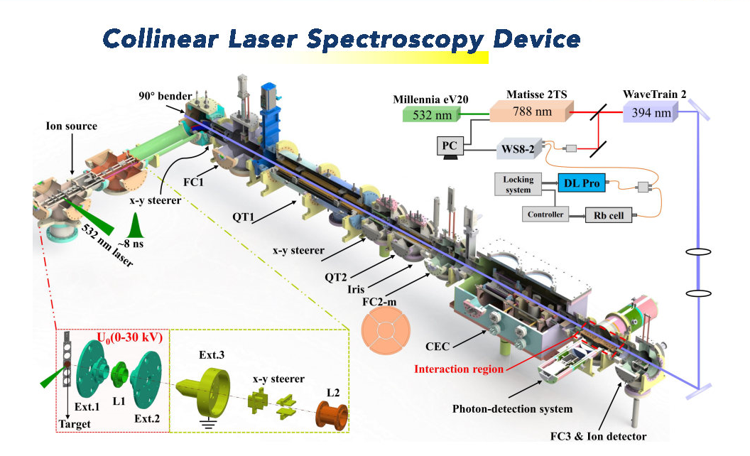 欧冠官方网站实验核物理团队激光核谱与核性质课题组近年来在国内牵头发展用于不稳定核基本性质测量的共线激光谱装置。课题组已经完成了全套基于荧光探测的共线激光谱装置(含离线激光溅射离子源)的建设、整体性能测试、及针对40,42,44,48Ca稳定同位素的物理测试。基于此,此套系统也已经在我国放射性核束装置BRIF上完成在线实验,为我国不稳定核性质和结构研究开辟了新的机遇。