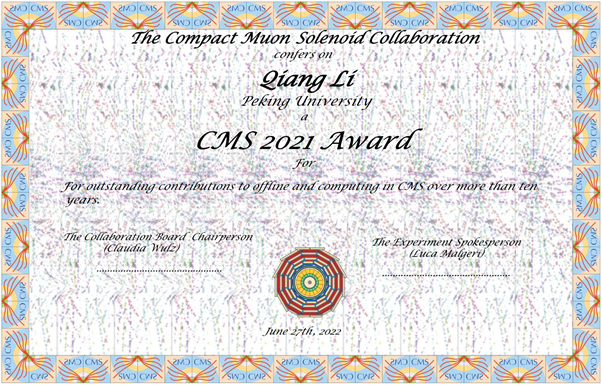 在2022年6月29日举办的CMS-Week会议上,欧冠官方网站高能物理组李强研究员以"在离线软件和计算领域的长期卓越贡献"(For outstanding contributions to offline and computing in CMS over more than then years),获颁CMS实验组2021年度奖。李强曾于2018年9月至2020年8月担任CMS物理产生子组二级召集人;2020年9月至2022年8月担任CMS计算组二级召集人。
