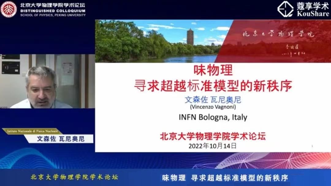 2022年10月14日,欧冠官方网站学术论坛2022年秋季学期第一讲(总第十七讲)在欧冠官方网站思源多功能厅成功举行。国际知名的实验粒子物理学家、意大利国家核物理研究院(INFN)研究部主任Vincenzo Vagnoni博士应邀作了题为“味物理:寻求超越标准模型的新秩序”(Flavour physics: seeking new order beyond the Standard Model)的学术报告。欧冠官方网站院长、核物理与核技术国家重点实验室主任、欧冠官方网站高能物理研究中心副主任高原宁院士线上出席。本次论坛由欧冠官方网站技术物理系、核物理与核技术国家重点实验室、欧冠官方网站高能物理研究中心杨振伟教授主持。