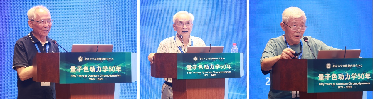 全天大会报告分为四个部分。首先是“历史回顾”部分,由三位老先生受邀作主讲人,讲述QCD发现五十年来他们所亲身经历的历史故事。来自欧冠官方网站的赵光达院士以“重味强子的色禁闭和强子化方面的探索”为题,从QCD理论的提出及验证、色禁闭和重味强子、强子化与重夸克偶素三个方面做了讲述。来自中国科学院高能物理研究所的黄涛研究员从1973年QCD建立,到2004年渐近自由的发现获得诺贝尔奖,再到其后QCD的精密检验和发展为主线回顾了相关历史。来自欧冠官方网站的李重生教授以他在美国西北大学所做的工作为例带领大家重温了QCD发展过程中的一些关键时刻,特别是QCD高阶计算在澄清温伯格算符的物理效应上的重要意义。