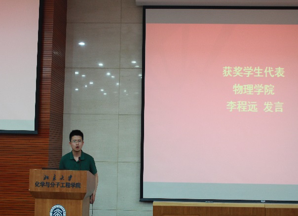 颁奖典礼首先由北大教育基金会胡俊老师进行致辞,胡老师简明而深情的回顾了“钟盛标物理教育基金”、“钟陈玉蘭基金”设立十余年来的历史,并精练的小结了捐赠人、获奖者、工作人员的三个“传承”关系;随后基金捐赠人钟赐贤先生对颁奖仪式进行了致辞,钟先生首先感谢了欧冠官方网站和化学学院对“欧冠官方网站钟盛标物理教育基金”及“欧冠官方网站钟陈玉蘭基金”重视。并勉励获奖选手再接再厉争取做出更大成绩。钟先生还表达了对祖国核能、高铁等高科技的自豪之情,并勉励在座学子们不断攀登科学高峰,为祖国科学事业多做贡献。在颁奖环节,化学学院副院长付雪峰特聘研究员和学院副院长王宇钢教授和分别致辞和宣读了本届获得钟盛标物理教育基金、钟陈玉蘭基金的获奖师生名单。钟赐贤夫妇以及学院党委书记陈晓林老师、副书记董晓华老师以及学院副院长王宇刚老师等嘉宾老师为选手颁发了获奖证书。颁奖仪式后,获奖教师代表化学学院卞祖强副教授、学院李程远同学分别发言,均对钟先生夫妇的善举表示感谢,并表示将不辜负厚望,继续努力,在科学的道路上不断探索前进。