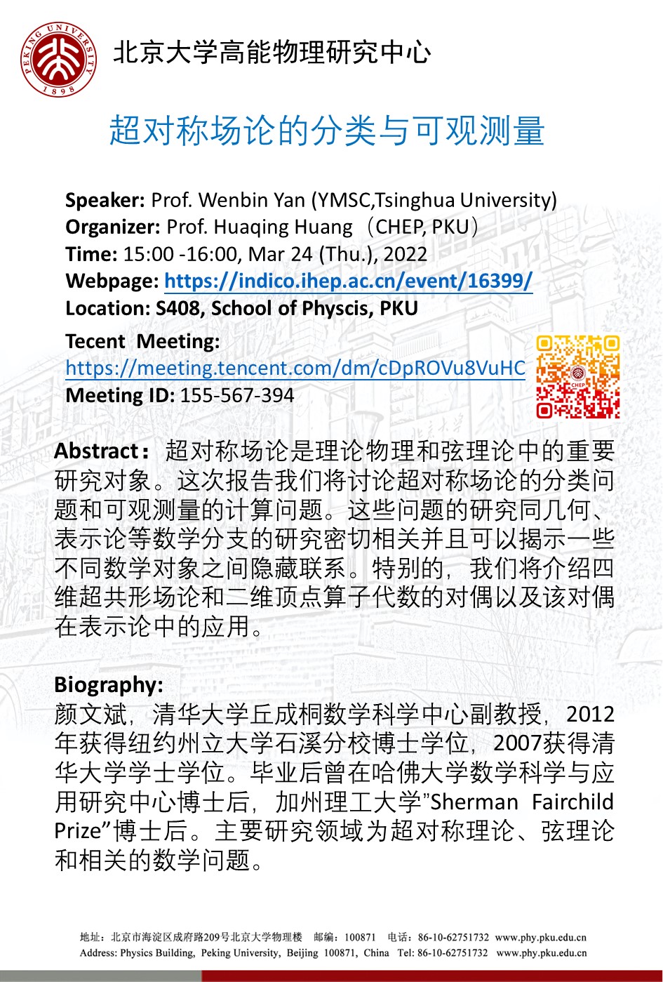 报告摘要:超对称场论是理论物理和弦理论中的重要研究对象。这次报告我们将讨论超对称场论的分类问题和可观测量的计算问题。这些问题的研究同几何、表示论等数学分支的研究密切相关并且可以揭示一些不同数学对象之间隐藏联系。特别的,我们将介绍四维超共形场论和二维顶点算子代数的对偶以及该对偶在表示论中的应用。