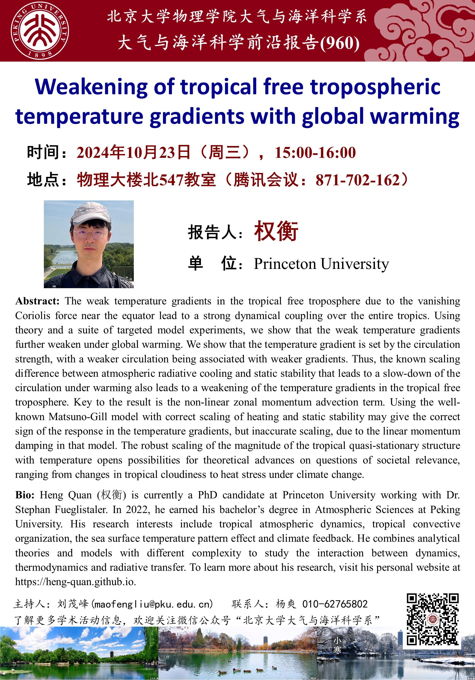 Heng Quan (权衡) is currently a PhD candidate at Princeton University working with Dr. Stephan Fueglistaler. In 2022, he earned his bachelor’s degree in Atmospheric Sciences at Peking University. His research interests include tropical atmospheric dynamics, tropical convective organization, the sea surface temperature pattern effect and climate feedback. He combines analytical theories and models with different complexity to study the interaction between dynamics, thermodynamics and radiative transfer. To learn more about his research, visit his personal website at https://heng-quan.github.io.