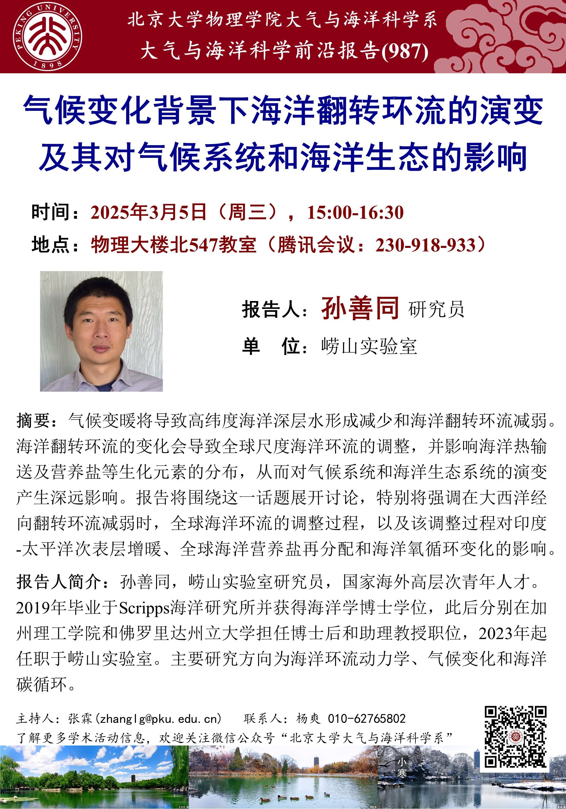 孙善同,崂山实验室研究员,国家海外高层次青年人才。2019年毕业于Scripps海洋研究所并获得海洋学博士学位,此后分别在加州理工学院和佛罗里达州立大学担任博士后和助理教授职位,2023年起任职于崂山实验室。主要研究方向为海洋环流动力学、气候变化和海洋碳循环。