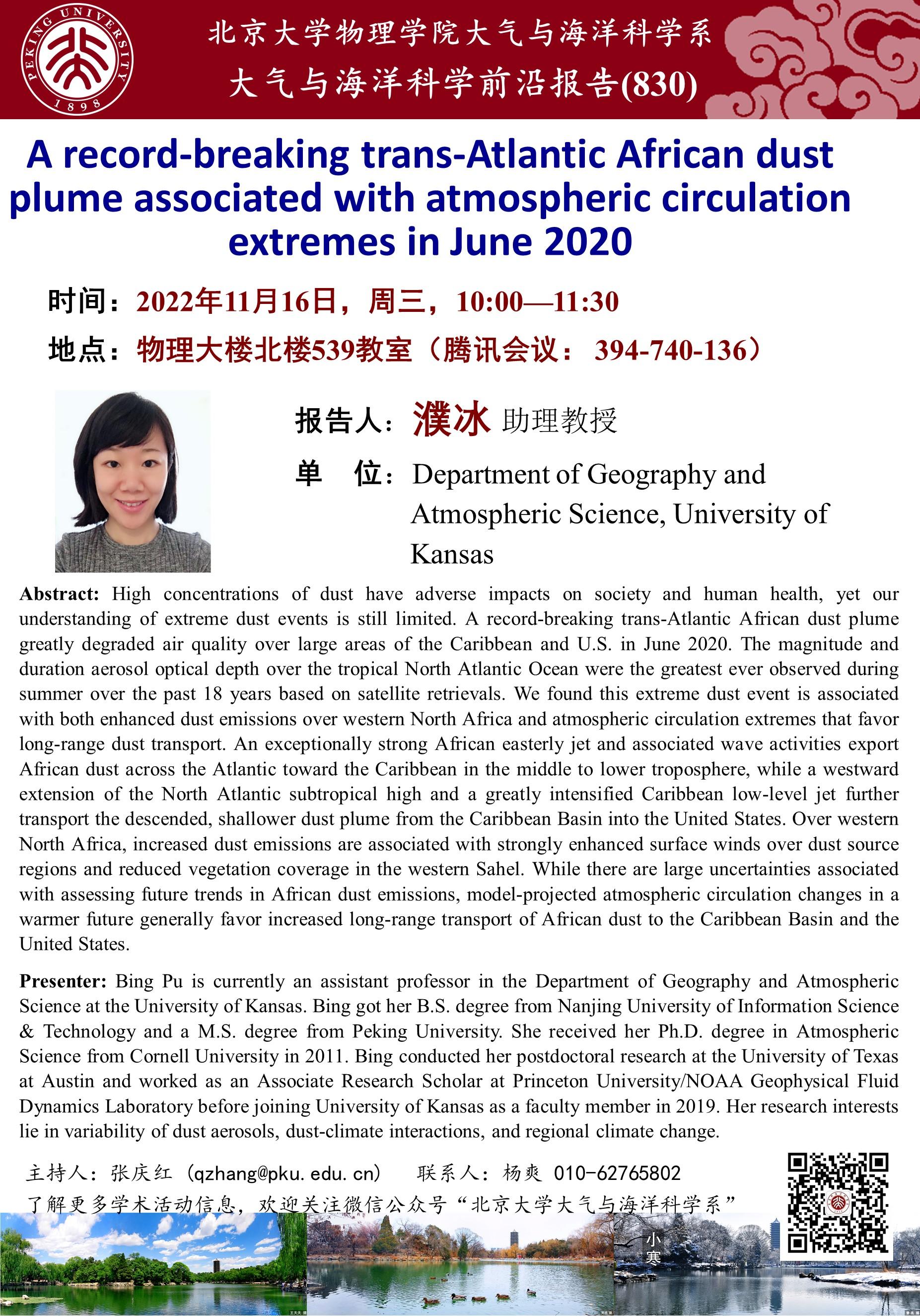 Bing Pu is currently an assistant professor in the Department of Geography and Atmospheric Science at the University of Kansas. Bing got her B.S. degree from Nanjing University of Information Science & Technology and a M.S. degree from Peking University. She received her Ph.D. degree in Atmospheric Science from Cornell University in 2011. Bing conducted her postdoctoral research at the University of Texas at Austin and worked as an Associate Research Scholar at Princeton University/NOAA Geophysical Fluid Dynamics Laboratory before joining University of Kansas as a faculty member in 2019. Her research interests lie in variability of dust aerosols, dust-climate interactions, and regional climate change.
