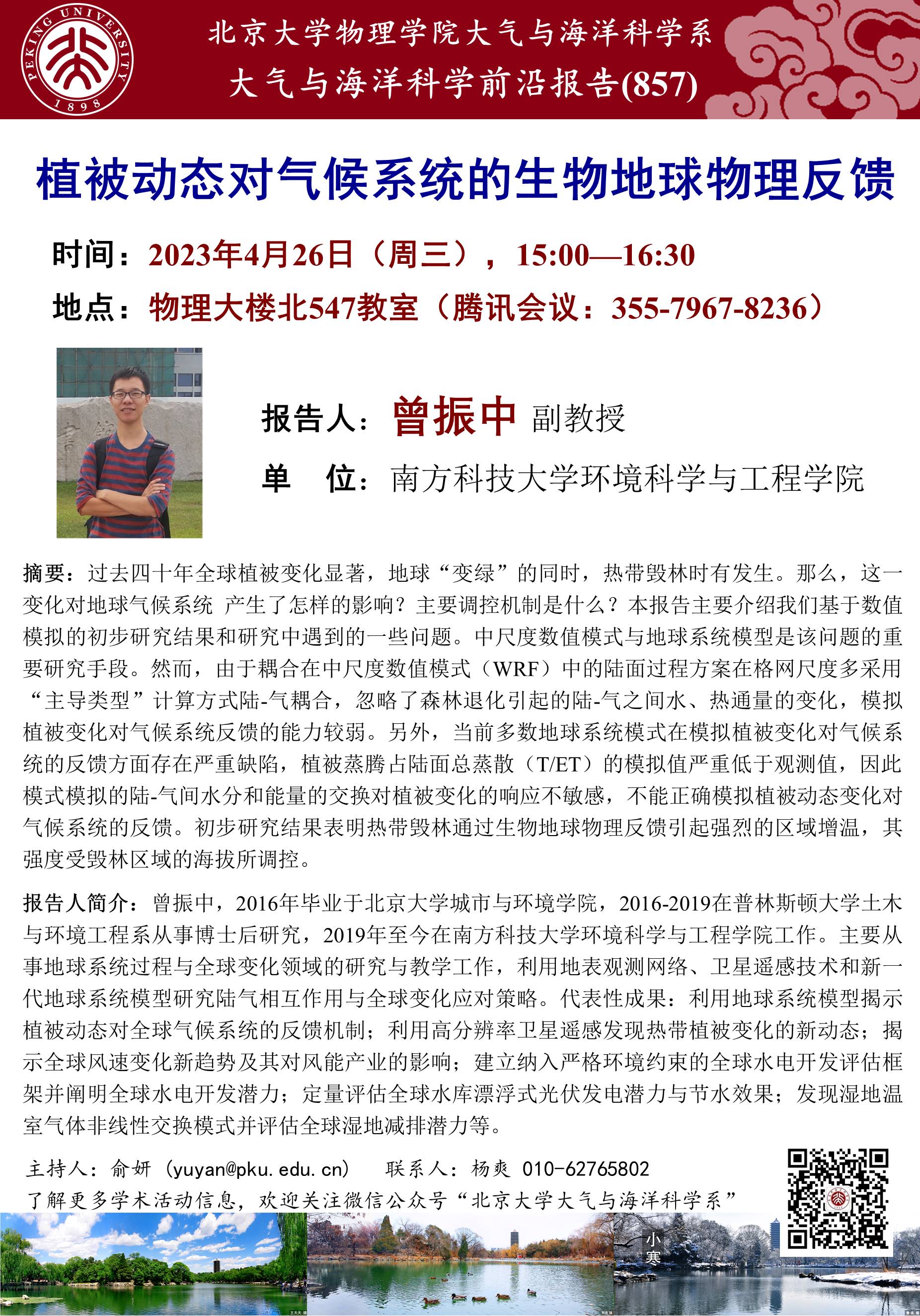 曾振中,2016年毕业于欧冠官方网站城市与环境学院,2016-2019在普林斯顿大学土木与环境工程系从事博士后研究,2019年至今在南方科技大学环境科学与工程学院工作。主要从事地球系统过程与全球变化领域的研究与教学工作,利用地表观测网络、卫星遥感技术和新一代地球系统模型研究陆气相互作用与全球变化应对策略。代表性成果:利用地球系统模型揭示植被动态对全球气候系统的反馈机制;利用高分辨率卫星遥感发现热带植被变化的新动态;揭示全球风速变化新趋势及其对风能产业的影响;建立纳入严格环境约束的全球水电开发评估框架并阐明全球水电开发潜力;定量评估全球水库漂浮式光伏发电潜力与节水效果;发现湿地温室气体非线性交换模式并评估全球湿地减排潜力等。