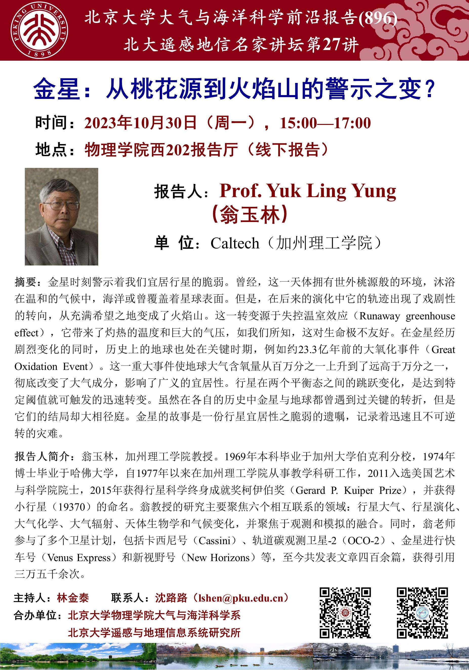 主讲人简介: 翁玉林,加州理工学院教授。1969年本科毕业于加州大学伯克利分校,1974年博士毕业于哈佛大学,自1977年以来在加州理工学院从事教学科研工作,2011入选美国艺术与科学院院士,2015年获得行星科学终身成就奖柯伊伯奖(Gerard P. Kuiper Prize),并获得小行星(19370)的命名。翁教授的研究主要聚焦六个相互联系的领域:行星大气、行星演化、大气化学、大气辐射、天体生物学和气候变化,并聚焦于观测和模拟的融合。同时,翁老师参与了多个卫星计划,包括卡西尼号(Cassini)、轨道碳观测卫星-2(OCO-2)、金星进行快车号(Venus Express)和新视野号(New Horizons)等,至今共发表文章四百余篇,获得引用三万五千余次。