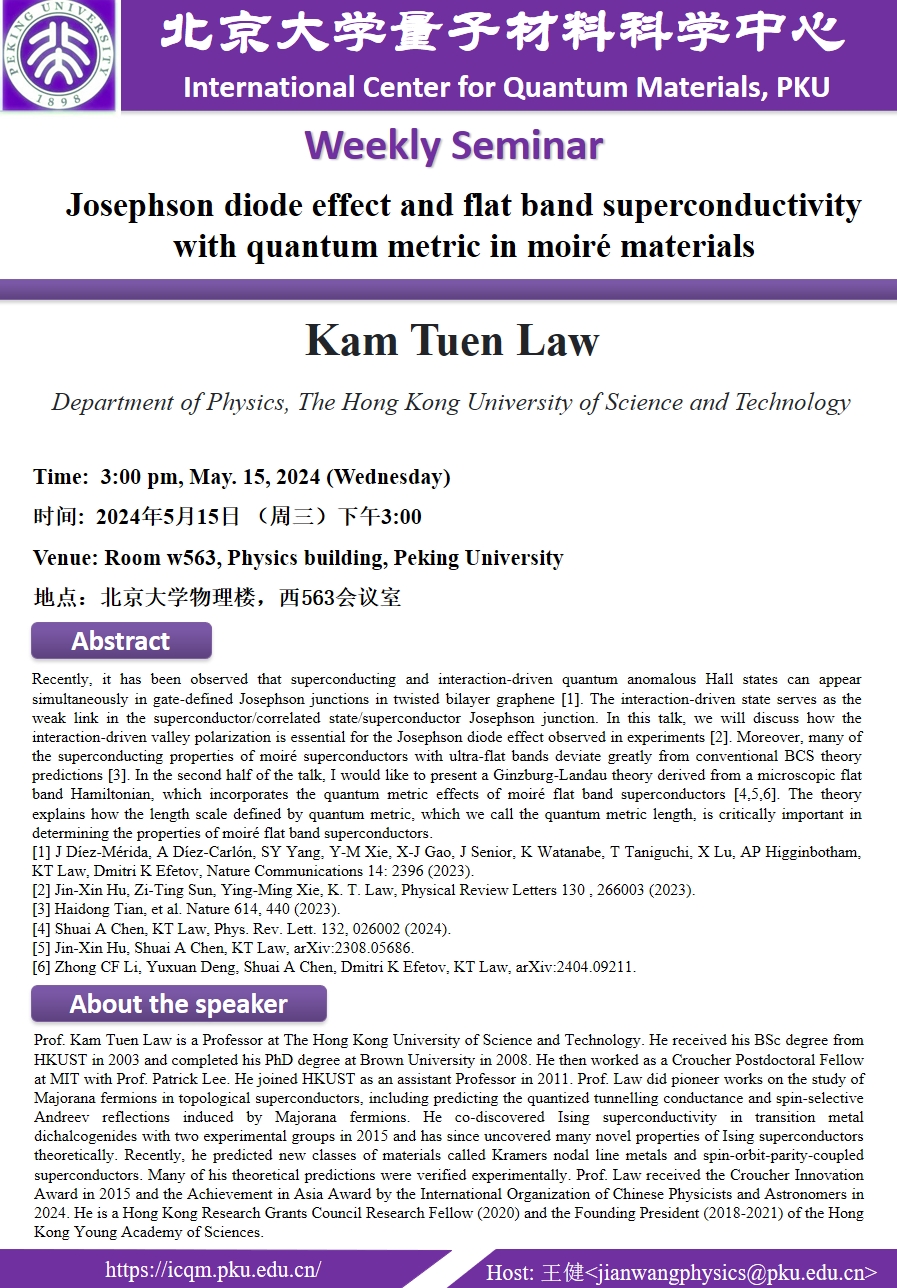 Prof. Kam Tuen Law is a Professor at The Hong Kong University of Science and Technology. He received his BSc degree from HKUST in 2003 and completed his PhD degree at Brown University in 2008. He then worked as a Croucher Postdoctoral Fellow at MIT with Prof. Patrick Lee. He joined HKUST as an assistant Professor in 2011. Prof. Law did pioneer works on the study of Majorana fermions in topological superconductors, including predicting the quantized tunnelling conductance and spin-selective Andreev reflections induced by Majorana fermions. He co-discovered Ising superconductivity in transition metal dichalcogenides with two experimental groups in 2015 and has since uncovered many novel properties of Ising superconductors theoretically. Recently, he predicted new classes of materials called Kramers nodal line metals and spin-orbit-parity-coupled superconductors. Many of his theoretical predictions were verified experimentally. Prof. Law received the Croucher Innovation Award in 2015 and the Achievement in Asia Award by the International Organization of Chinese Physicists and Astronomers in 2024. He is a Hong Kong Research Grants Council Research Fellow (2020) and the Founding President (2018-2021) of the Hong Kong Young Academy of Sciences.