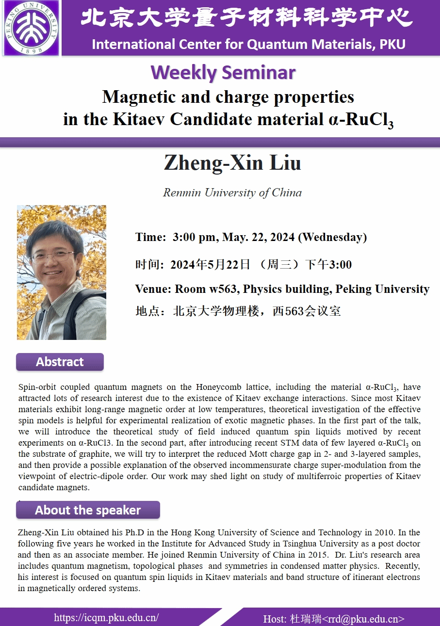 Zheng-Xin Liu obtained his Ph.D in the Hong Kong University of Science and Technology in 2010. In the following five years he worked in the Institute for Advanced Study in Tsinghua University as a post doctor and then as an associate member. He joined Renmin University of China in 2015. Dr. Liu's research area includes quantum magnetism, topological phases and symmetries in condensed matter physics. Recently, his interest is focused on quantum spin liquids in Kitaev materials and band structure of itinerant electrons in magnetically ordered systems.